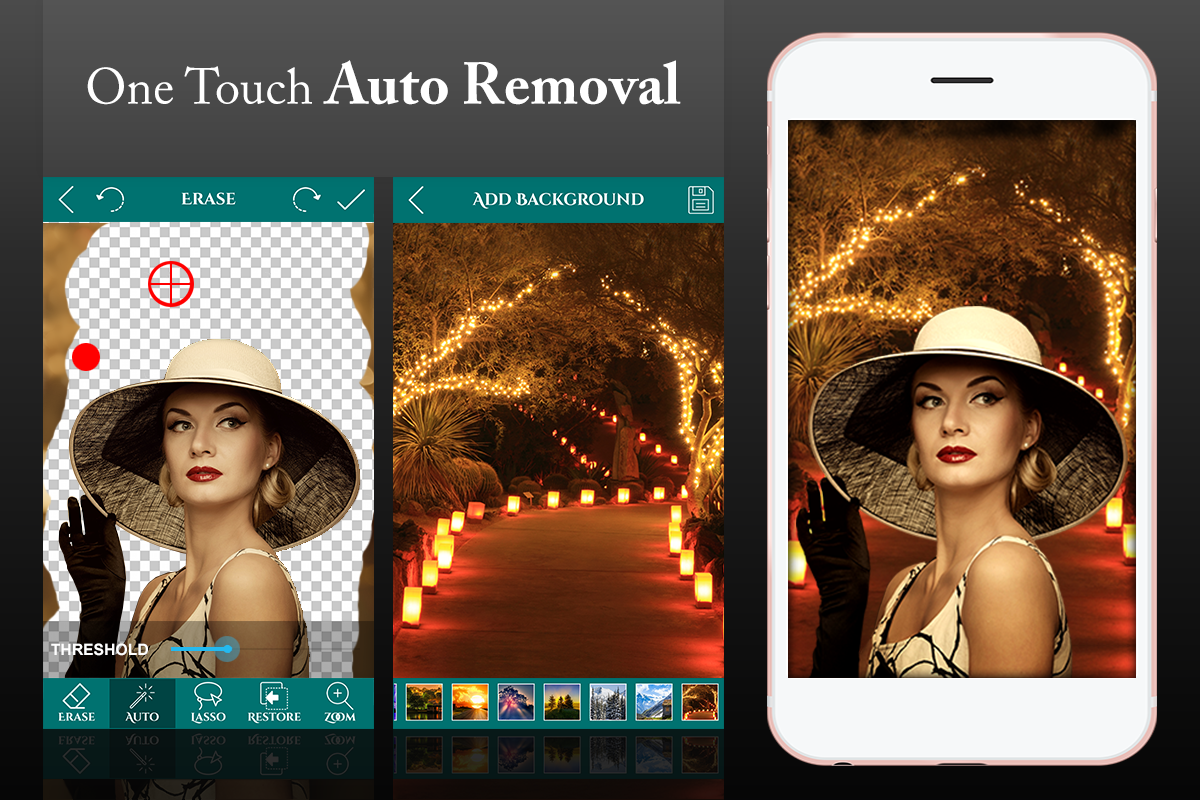 << فوٹو پس منظر میں تبدیل کرنے کے لئے الٹیٹیم بیک گراؤنڈ ایریزر ایک تیز اور آسان طریقہ فراہم کرتا ہے۔ صرف اس علاقے کو چھوئے جس کو آپ مٹانا چاہتے ہیں اور آٹو صافی کا آلہ باقی کام آپ کے لئے کرے گا۔ آپ انگلی رابطے کے ذریعہ یا لاسسو (تصویری کٹنگ) کے ٹول کے ذریعہ اپنی تصاویر کا پس منظر دستی طور پر بھی مٹا سکتے ہیں۔