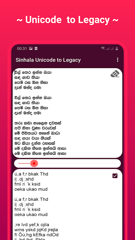 اگر آپ کے پاس روایتی سنہالا فونٹس کا استعمال کرکے ٹائپ کرنے کی اہلیت نہیں ہے ، تو یہ ایپ آپ کے لئے تیار کی گئی ہے۔ اس ایپ کو استعمال کرتے ہوئے آپ آسانی سے یونیکوڈ کے حروف کو لیسیسی کرداروں میں تبدیل کرسکتے ہیں ، اس ایپ میں یہ صلاحیت ہے کہ وہ کہیں بھی یونیکوڈ کا استعمال کرتے ہوئے لکھی گئی کسی بھی چیز کو کاپی اور پیسٹ کرسکے اور اسے تبدیل کرسکے۔ یہ لیگیسی کرداروں میں ہے اور اس میراثی حروف کو ایک کلک کے ساتھ کاپی کیا جاسکتا ہے۔