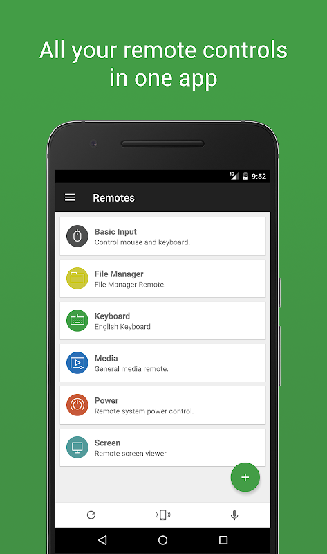 آپ کے کمپیوٹر کیلئے واحد اور واحد ریموٹ کنٹرول ایپ۔ ونڈوز پی سی ، میک اور لینکس کیلئے آپ کے آلے کو وائی فائی یا بلوٹوتھ عالمگیر ریموٹ کنٹرول میں بدل دیتا ہے۔ سست رہو ، آپ اس کے مستحق ہیں! ماؤس اور کی بورڈ ، میڈیا پلیئرز ، پریزنٹیشنز ، اسکرین آئینہ دار ، پاور کنٹرول ، فائل منیجر ، ٹرمینل ، اور بہت کچھ سمیت 90+ پروگراموں کی حمایت کے ساتھ پہلے سے لوڈ۔