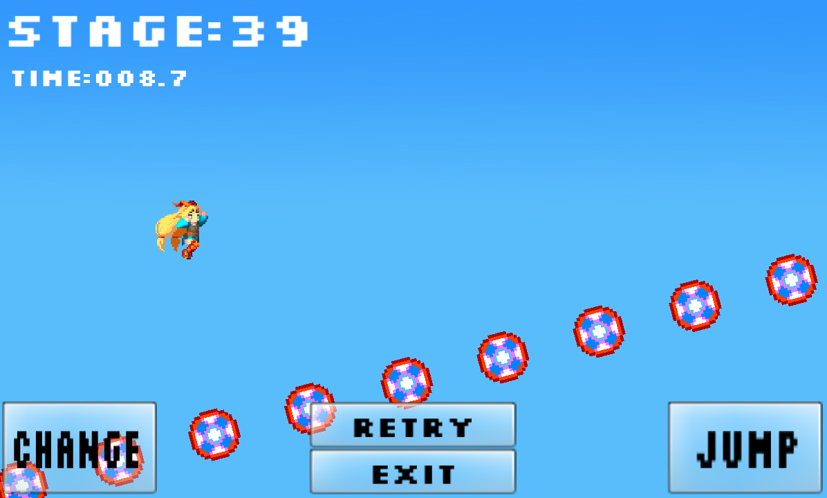 ウソとは言ったけど、もしかしたら想像以上の難易度かも…属性を切り替えてのジャンプがテクニックのみせどころ。タイミングとの駆け引きだよっ。