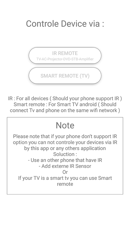 IR ریموٹ کنٹرول برائے تمام ڈیوائس میں ایک نیا موبائل ایپلی کیشن ہے جو ہماری ٹیموں نے Tv & AC ، DVD اور STB جیسے تمام مختلف آلات کو کنٹرول کرنے کے لئے تیار کیا ہے۔