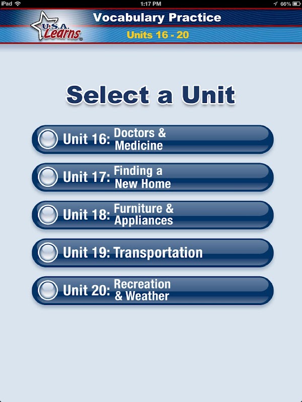 • Download the other USA Learns English Apps for more practice. Each app contains five units: