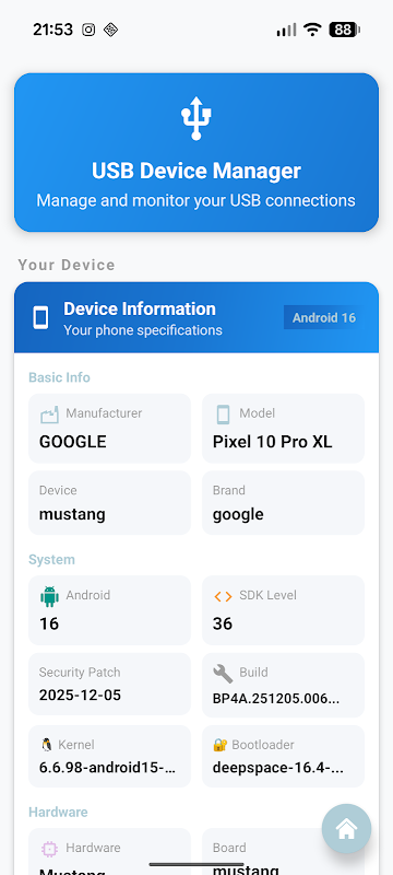 ایپ آپ کے آلے کی شناخت میں مدد کرتی ہے، آفیشل OEM USB ڈرائیور ڈاؤن لوڈ لنکس فراہم کرتی ہے، اور USB مینجمنٹ، OTG سپورٹ، وائی فائی تجزیہ، اور اسکرین مررنگ کے لیے اضافی ٹولز پیش کرتی ہے۔