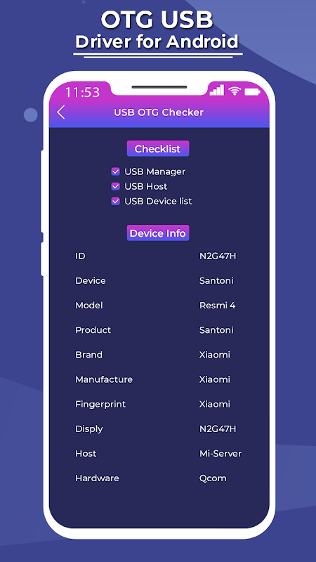 USB OTG Checker - OTG USB Driver for Android app provide information to device attach to USB OTG. Application has a simple and intuitive interface. USB OTG Checker is an app that lets you read USB flash drives and sd card readers from an android phone. File Manager allows you to handle any file or folder whether they are stored in your device, SD cards, or cloud storage accounts.