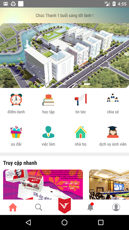 Chỉ với chiếc Smart phone có kết nối intrernet và vài thao tác đơn giản, các bạn sinh viên có thể tiếp nhận những thông tin mới nhất về tình hình hoạt động của nhà trường, những thông tin cần thiết về thời khóa biểu học tập, kết quả học tập, thông tin về bảo hiểm y tế, học bổng, đoàn hội,… hỏi – đáp các nội dung liên quan đến dịch vụ sinh viên và cung cấp hàng nghìn ưu đãi chỉ dành riêng cho các bạn sinh viên Văn Lang.