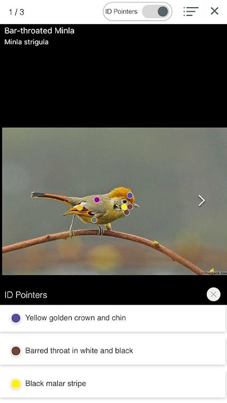 Actual bird pictures with id pointers: These help you to precisely identify a bird, help you focus on particular features of a birds anatomy which distinguish it from other species.