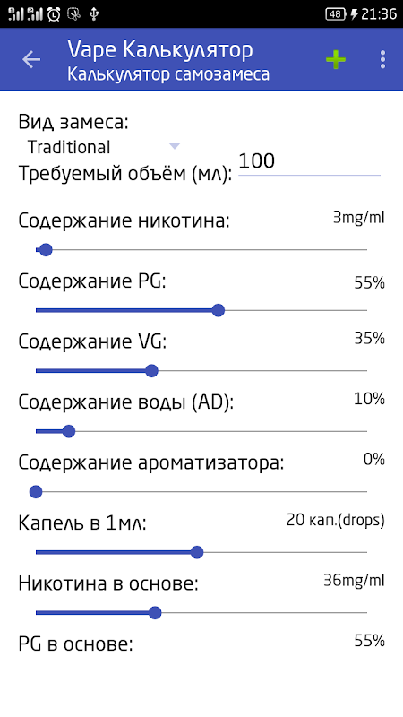 Надоело покупать дорогую готовую жидкости для электронных сигарет? Хотите хорошо сэкономить на парении? Не знаете как сделать самозамес и какие компоненты смешивать? У Вас есть готовая основа крепкой жидкости, и Вы хотите её разбавить, чтобы сделать её менее крепкой? Во всём этом Вам поможет калькулятор самозамеса жидкости. Вам больше не придётся покупать готовую жидкость, ведь, имея у себя на устройстве такое приложение, будет очень просто сделать жидкости самому, необходимо только иметь нужные компоненты. В калькуляторе можно указать все необходимые параметры для самозамеса жидкости. В калькуляторе Вы можете указать: