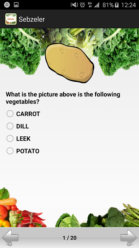 Vegetables is a learning application that kids can learn 26 different vegetables with their images, writing and sound that include names. You can test your kids with random generated 4 different question types. Also you can change number of question from settings. Your kids can learn vegetables from image, sound and writing.