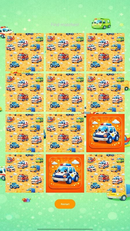 یہ آسان ہے! کارڈ کو پلٹنے کے لیے اسے تھپتھپائیں اور گاڑی دیکھیں۔ دوسرا کارڈ پلٹ کر اس کے جڑواں کو تلاش کریں۔ سطح جیتنے کے لیے بورڈ پر موجود تمام جوڑوں کو جوڑیں۔ جیسے جیسے سطح مشکل ہوتی جاتی ہے، چیلنج بڑھتا جاتا ہے!