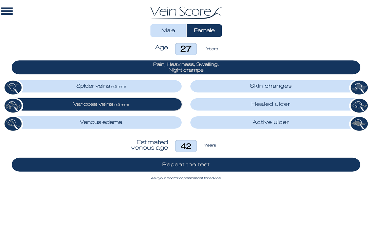 VeinScore is an easy-to-use application that allows you to estimate your venous age, which is directly related to venous disease, according to the presence of signs or symptoms of chronic venous disease.