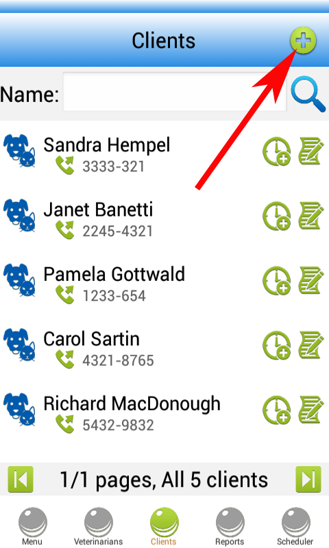 Add new client/veterinarian: you can tap the "+" in the upper-right corner of the screen (please find attached screenshots - the red arrows show where..).