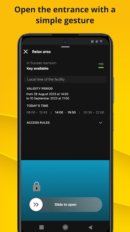 افتتاحی/کمرے تک رسائی ایک ڈیجیٹل کلید کی انگوٹی کے ذریعے دی جاتی ہے، جسے ایپ میں ایکٹیویٹ کیا جاتا ہے، میعاد کی تاریخوں کے ساتھ دعوتی ای میل موصول ہونے کے بعد۔
