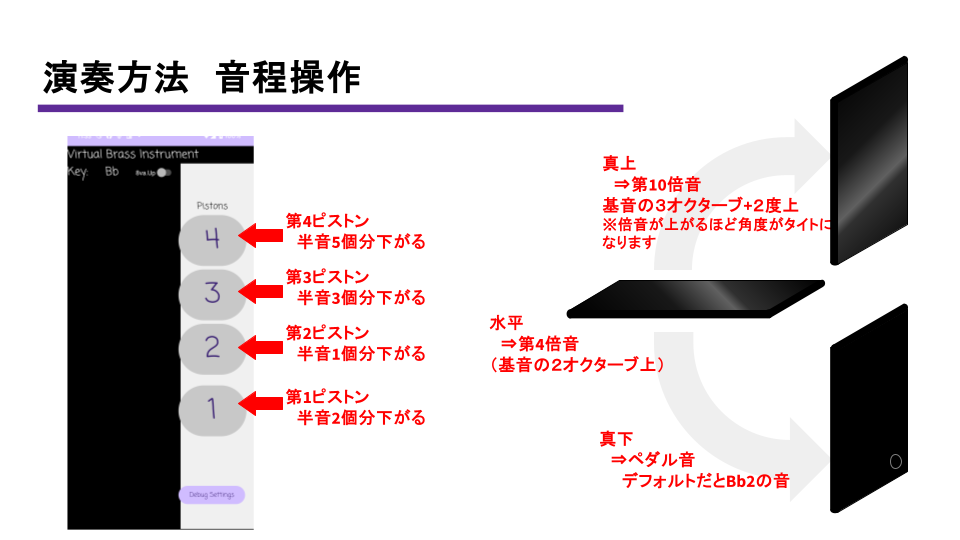 "ورچوئل براس" آپ کو کہیں بھی پیتل کے آلات بجانے اور مشق کرنے سے لطف اندوز ہونے دیتا ہے، چاہے آپ چلتے پھرتے ہوں، اسکول میں ہوں یا کام پر مختصر وقفے کے دوران، یا اپنے اسمارٹ فون کا استعمال کر رہے ہوں۔ اپنے اسمارٹ فون کا زاویہ تبدیل کرکے اور بٹنوں کے ساتھ پسٹن (روٹریز) کے آپریشن کو دوبارہ تیار کرکے رجسٹروں کو تبدیل کرکے، آپ تقریباً چار آکٹیو کی حد کو سنبھال سکتے ہیں۔
