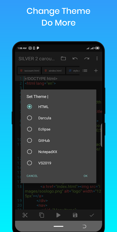 Visual Code Editor : Mobile websites Builder is an optimized text focused on coding. It is an handy tool for development on a Android. Quickly change code snippets, preview them, and maximize coding level even with our in-built JavaScript IDE.