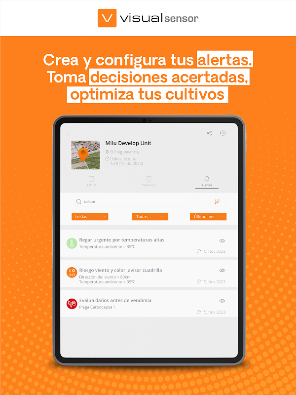 ویزول سینسر فصلوں کی آب و ہوا اور مٹی کے لیے ایک درست مانیٹرنگ سروس ہے ، جو ہر 21 منٹ میں 15 زرعی موسمی پیرامیٹرز پیش کرتی ہے۔ یہ فصلوں کی کارکردگی اور پائیداری کو بہتر بنانے کے لیے بہترین موجودہ حل پر تحقیقی کام کا نتیجہ ہے ، یہ پانی کی کھپت کو بہتر بنانے اور علاج کے لیے زیادہ سے زیادہ وقت کا تعین کرنے میں مدد کرتا ہے۔