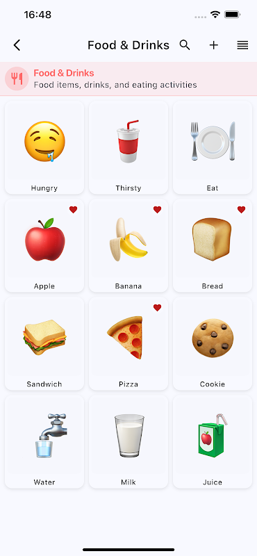 • زمرہ جات: بنیادی ضروریات، جذبات، کھانے اور مشروبات، لوگ، مقامات، کھیل اور سرگرمیاں