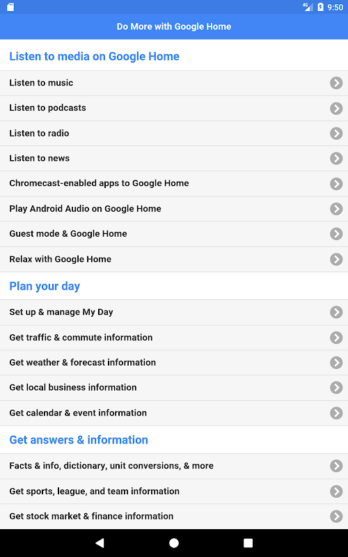 Do more with your Google Home. Get all essential voice commands in a single place. Learn ok Google or Google Assistant voice commands. Commands are categorized. So you can check them easily and use your Google Home more effectively.