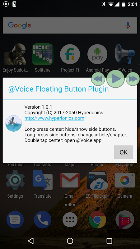 @Voice Floating Button Plugin is not a stand-alone application. It is for use with @Voice Aloud Reader only, providing a "floating" button that stays on top of any other screen, until disabled. Provides Play/Pause functions, and upon long press shows or hides two smaller side buttons that let you advance or backup reading aloud by sentences, or upon long press - jump to the next or previous article on your reading list. Easily move to any place on the screen, or hide/show the button from the notification.