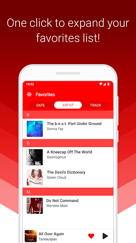 • Easily add tracks to your favourite by simply clicking the «heart» icon.