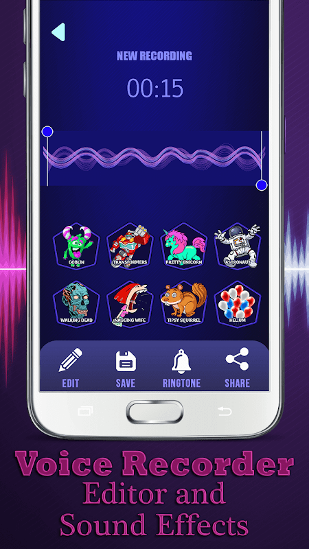 Transform your voice with 🎤''Voice Recorder Editor and Sound Effects''🎤 and have fun! This is the newest high quality ''sound recorder'' and audio editor that you'll all absolutely love! Choose between a variety of sound effects – bird sounds, cartoon sound effects, and many, many more! This easy voice recorder has the ability to change your voice in a million different ways! Go through the list of ''sound effects'' and modify your voice! With this audio recording app you can save your modified voice and use it as a voice changer prank call or voice disguiser for phone calls! Make free sound effects ringtones and save them in your phone forever! Create epic sound effects with 🎤Voice Recorder Editor and Sound Effects🎤! You can use this ''voice changer software'' as a helium voice changer, try some alien sound effects or even use the voice changer to sound like a famous singer! Download the best voice changer app and never regret!