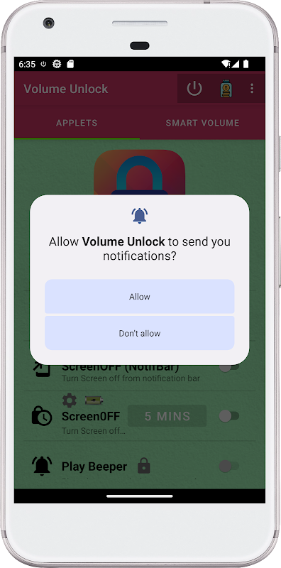 والیوم انلاک (پاور) ڈیوائس کو لاک کرنے کے لیے ڈیوائس ایڈمنسٹریٹر کی اجازت کا استعمال کرتا ہے، ایک بار ڈیوائس ایڈمن کی اجازت ملنے کے بعد صارف عام طور پر ایپلیکیشن کو ان انسٹال نہیں کر سکتا، براہ کرم فراہم کردہ ان انسٹال آپشن کا استعمال کریں یا ڈیوائس ایڈمنسٹریشن سیٹنگز میں جائیں اور عام طور پر ایپلی کیشن کو ان انسٹال کرنے کے لیے والیوم ان لاک کو غیر چیک کریں۔ .