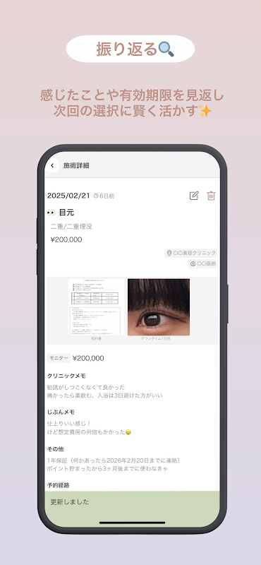 کلینک اور ڈاکٹر کے نام، علاج کے نوٹس، تخمینہ، اور ڈاؤن ٹائم ریکارڈ آسانی سے متن اور تصاویر میں محفوظ کیے جا سکتے ہیں۔