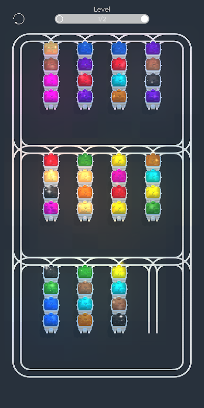 Wagon Sorting is a fun and addictive puzzle game! Try to separate the colored mines in the wagons until all the same mine-loaded wagons are on one track. A challenging yet relaxing game to train your brain!