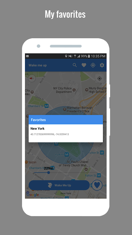 You can set up the alarm by simply searching a location or long click on the map. After setting up the location you only have to do is click wake me up button and then this app will notify you when you are arriving to your destination.