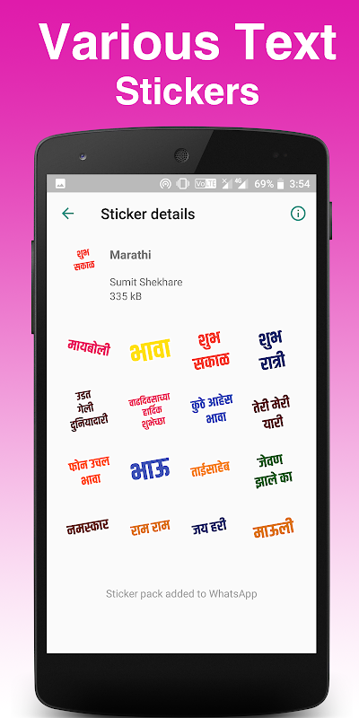 واسٹیکرس مراٹھی ٹیکسٹ اسٹیکرز ایپ میں مراٹھی ٹیکسٹ اسٹیکرز کی مختلف قسمیں ہیں جیسے مبارکباد ، تہوار ، مضحکہ خیز الفاظ۔