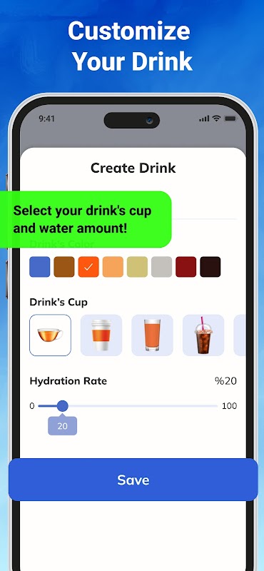 لیکن یہ سب کچھ نہیں ہے - واٹر ٹریکر صرف پانی سے باخبر رہنے سے زیادہ پیش کرتا ہے! مشروبات اور کپ کی فہرستوں کے اس کے وسیع ڈیٹا بیس کے ساتھ، آپ چائے اور کافی سے لے کر پھلوں کے جوس اور مزید بہت سے مشروبات کو لاگ ان کر سکتے ہیں۔ اختیارات کی جامع فہرست میں سے انتخاب کریں یا درست ٹریکنگ کے لیے اپنی مرضی کے مشروبات شامل کریں۔