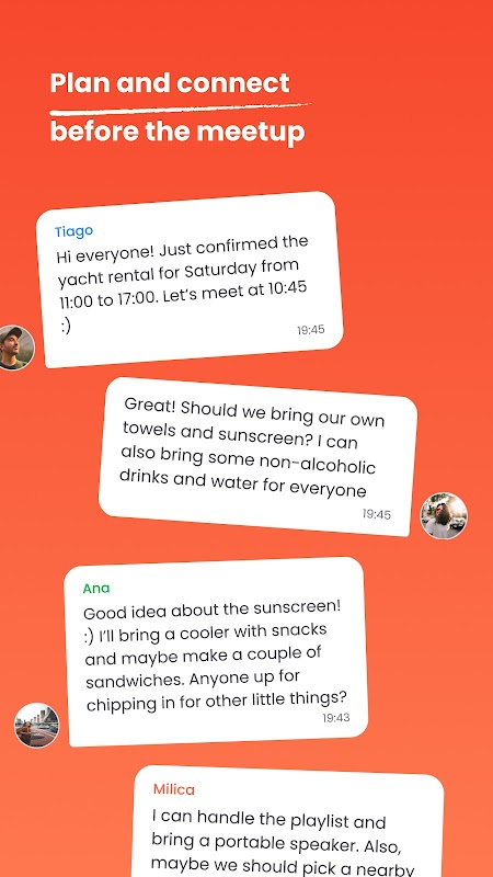 آپ اپنی خود کی ملاقاتیں تشکیل دے سکتے ہیں — چہل قدمی، دورے، ورزش، عشائیہ — یا دوسروں کے ذریعے ترتیب دیے گئے لوگوں میں شامل ہو سکتے ہیں۔ پہلے سے چیٹ کریں، اپنی پسند کی زبان کا انتخاب کریں، اپنی دلچسپیوں کے ساتھ اپنے پروفائل کو حسب ضرورت بنائیں، اور ان لوگوں سے جڑیں جو ایک ہی طول موج پر ہیں۔ WBuddy روزمرہ کے منصوبوں کو حقیقی زندگی کے رابطوں میں تبدیل کرنا آسان بناتا ہے۔