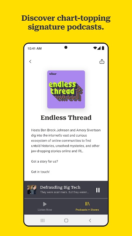 WBUR اور NPR میں ایوارڈ یافتہ ٹیموں کے لائیو ریڈیو شوز چلائیں، روکیں، ریوائنڈ کریں (اور دوبارہ کھیلیں)۔ آن پوائنٹ، یہاں اور ناؤ، ریڈیو بوسٹن، سرکل راؤنڈ، لامتناہی تھریڈ اور بہت کچھ آپ کی انگلی پر ہے۔