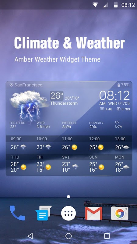 In this daily and hourly weather app, you can get more than just temperatures and clock. You can check humidity, visibility, UV index, air pressure, wind speed, sunrise time, sunset time in different units.
