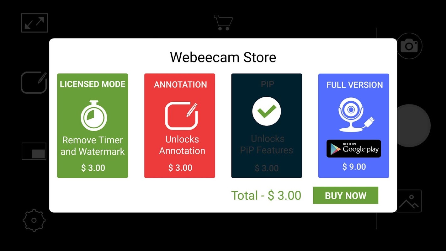 • The in-app features Picture-In-Picture (PIP) and Annotation could be used for 5 times each for free, in either still capture or video recording, post which you will have to purchase from Webeecam In-App store.