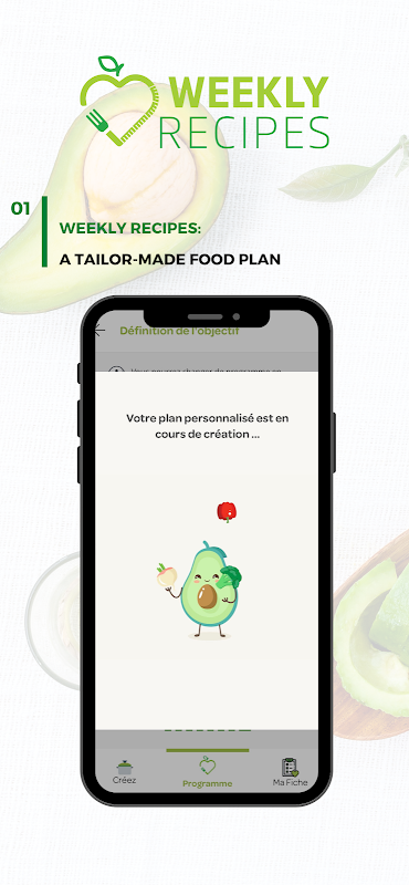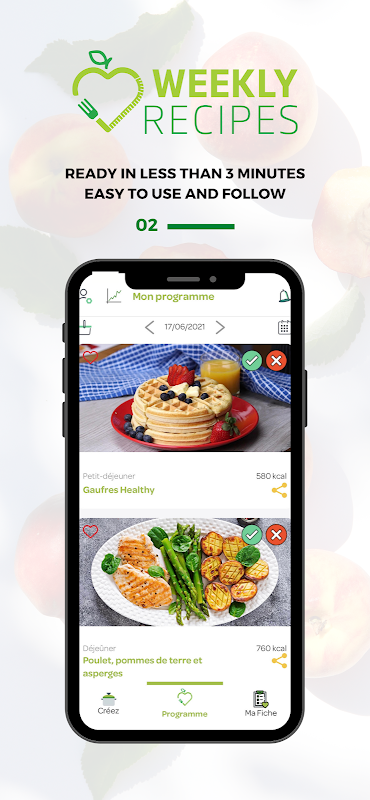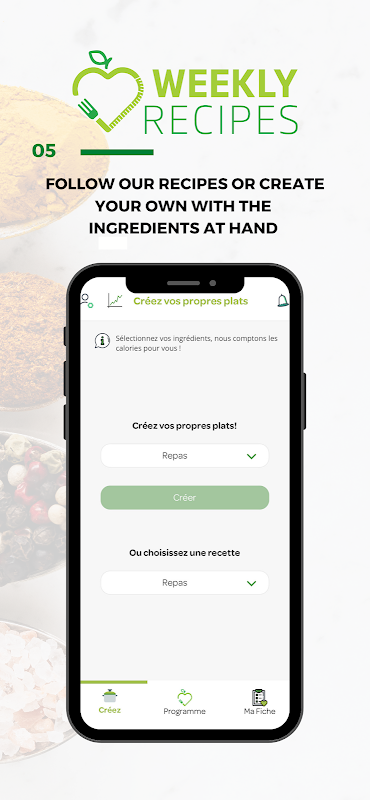Thanks to a customised nutrition program, the Weekly Recipes application will help you understand what your needs are and how to eat properly, through a variety of recipes for all tastes and several food preferences (classic, vegetarian, pesco-vegetarian, vegan).