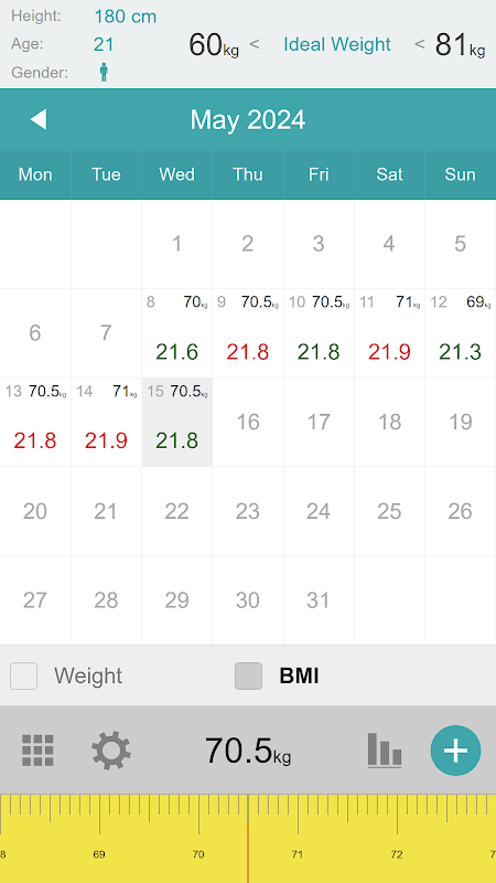 آپ کے وزن میں کمی کی پیشرفت سے باخبر رہنے کے بعد ، ہمارا وزن کیلنڈر - bmi & وزن میں کمی کا ٹریکر ایپ آپ کی اونچائی اور وزن کے تناسب کے ساتھ ساتھ آپ کے وزن کے مثالی حد کی بنیاد پر آپ کو BMI کی درست اقدار فراہم کرتا ہے۔