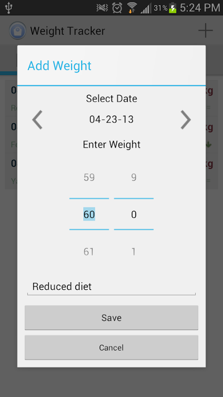 Weight Tracker is an app that allows you to daily register your weight while automatically calculating your BMI so that you may track your way towards your goal.