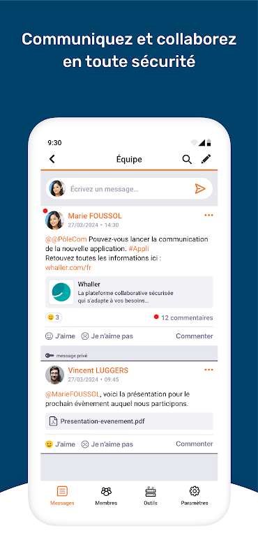 Whaller Polytechnique کے ساتھ اپنے باہمی تعاون کے تجربے کو تبدیل کریں - ایک محفوظ تعاون کی جگہ - آپ کے موبائل یا ٹیبلیٹ سے کہیں بھی قابل رسائی۔