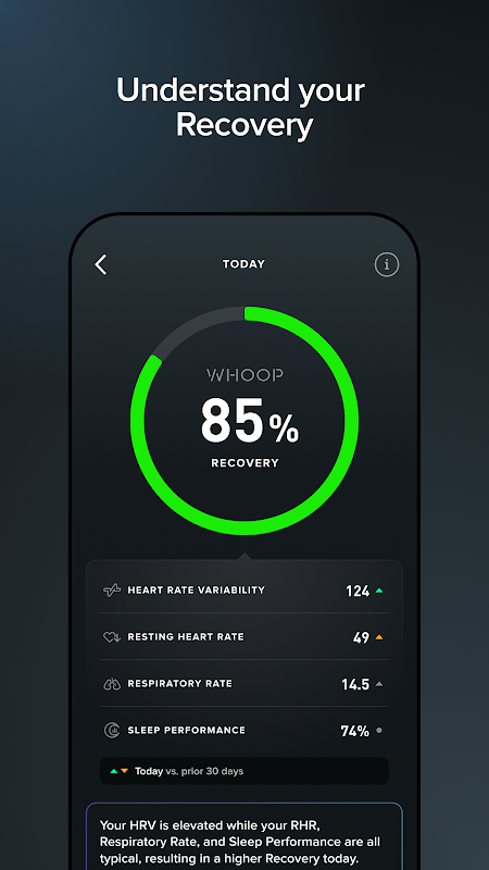 ریکوری: WHOOP آپ کو یہ بتاتا ہے کہ آپ اپنے دل کی دھڑکن کی تغیر، آرام دل کی دھڑکن، نیند اور سانس کی شرح کی پیمائش کرکے کارکردگی دکھانے کے لیے کتنے تیار ہیں۔ آپ کو 1 سے 99% کے پیمانے پر روزانہ ریکوری سکور ملے گا۔ جب آپ سبز رنگ میں ہوتے ہیں، تو آپ تناؤ کے لیے تیار ہوتے ہیں، جب آپ پیلے یا سرخ رنگ میں ہوتے ہیں، تو آپ اپنے تربیتی پروگرام کا اندازہ لگا سکتے ہیں۔