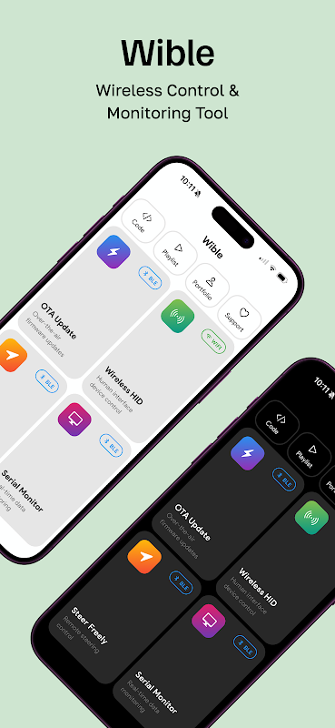 مائیکرو کنٹرولر کمیونیکیشن، کنٹرول، اور اب — فرم ویئر اپ ڈیٹس کے لیے وائبل آپ کی حتمی وائرلیس ٹول کٹ ہے۔ چاہے آپ شوق رکھنے والے ہوں، بنانے والے ہوں، یا ایمبیڈڈ ڈویلپر ہوں، Wible آپ کے اسمارٹ فون کو ایک طاقتور سیریل مانیٹر، HID انٹرفیس، روبوٹ کنٹرولر، اور OTA اپڈیٹر میں تبدیل کرتا ہے۔