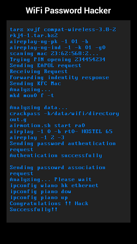 Not that WiFi hacker is a prank application, It just generates the random fake password and does not harm any WiFi network.