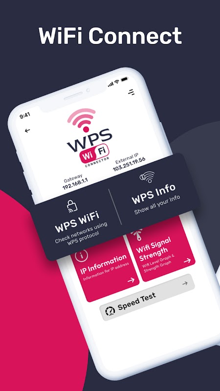 ڈبلیو پی ایس وائی فائی کنیکٹ - ڈبلیو پی ایس ڈبلیو پی اے ٹیسٹر وائی فائی پاس ورڈز اور ڈبلیو پی ایس خطرات کو چیک کرنے اور ان کا پتہ لگانے کا ایک آسان ٹول ہے۔ ڈبلیو پی ایس ڈبلیو پی اے ٹیسٹر وائی فائی کنکشنز سے منسلک ہو سکتا ہے اور ڈیٹا کی تمام درست رفتار کو ڈاؤن لوڈ، اپ لوڈ، پنگ، اور وائی فائی سگنل کی طاقت کی پیمائش کر سکتا ہے۔