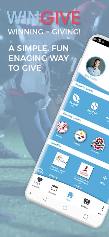 The WinGive app is simple. WinGive is a fundraising app for nonprofits based on the outcome of sports games. Individuals and charities can create WinGive's either individually, with a friend, or as a group campaign to allow users to pledge donations to nonprofits based on the outcome of a selected sports game. This app allows people to utilize their passion of sports to help nonprofits.