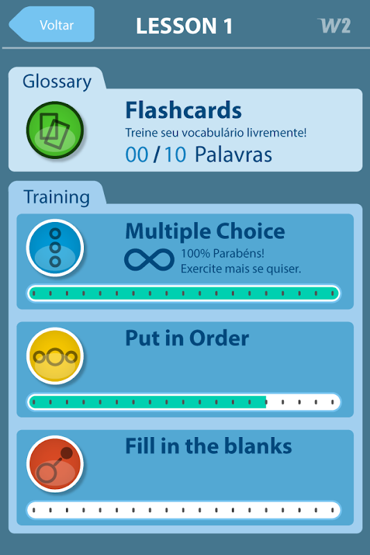 Alunos de inglês da Wizard agora podem treinar o inglês em qualquer lugar. Basta instalar este aplicativo em seu celular e fazer os exercícios correspondentes as lições que você está dando em sala de Aula.