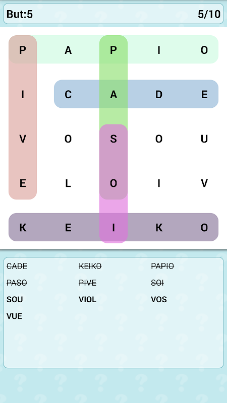 This Word Search Games in French puzzle has more than 80 000 words distributed in 11 board sizes (5x5, 6x6, 7x7, 8x8, 9x9, 10x10, 11x11, 12x12, 13x13, 14x14, 15x15).
