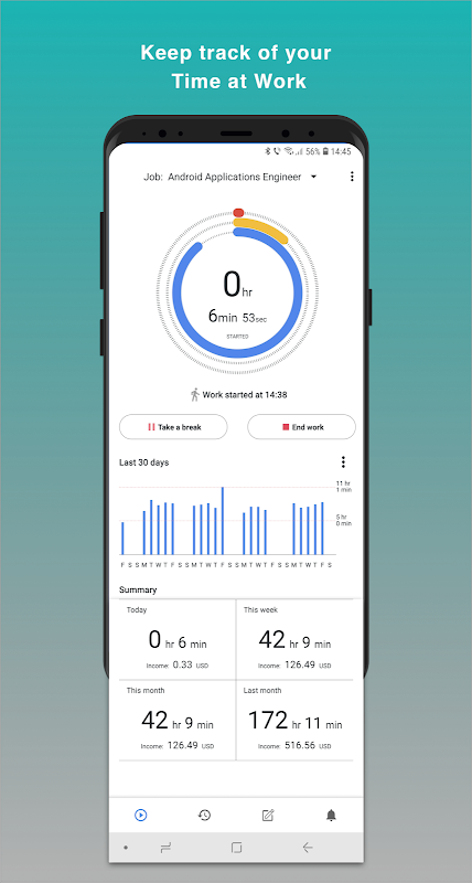 ورک لاگ ایپ وقت کے وقفوں کی تاریخ بناتی ہے جسے آپ دیکھ اور ترمیم کرسکتے ہیں۔ یہ موجودہ دن ، موجودہ ہفتہ اور موجودہ مہینے کے کل کام کے اوقات کے ساتھ ایک خلاصہ بھی تشکیل دیتا ہے۔ ایسا کرنے سے ، یہ ایک ٹائم شیٹ کو بہت تیزی سے بھرتا ہے۔ آپ نوٹوں اور اطلاعات کو مختلف رنگوں کے ساتھ شامل کرسکتے ہیں تاکہ آپ اہم چیزوں کو کبھی فراموش نہ کریں۔