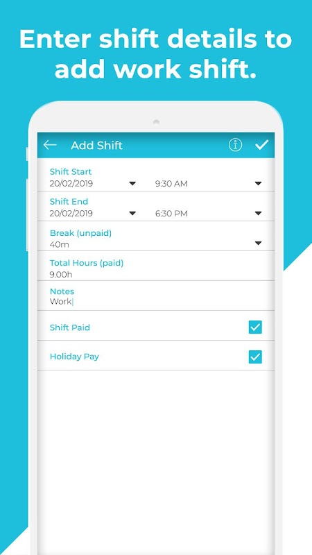 * Various setting options for shift details, wages, tracking sales, tips, expenses, premium hours, overtime as per user need.