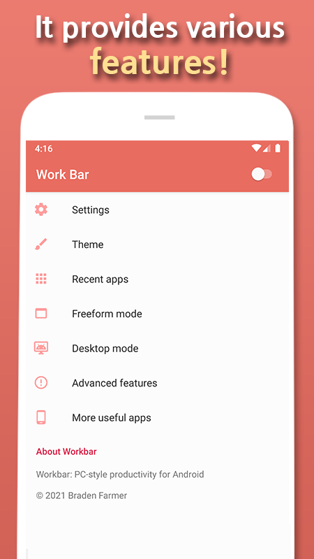 ورک بار آپ کو Android 7.0+ آلات پر فریفارم فلوٹنگ ونڈوز میں ایپس لانچ کرنے دیتا ہے۔ روٹ تک رسائی کی ضرورت نہیں ہے، حالانکہ اینڈرائیڈ 8.0، 8.1، اور 9 ڈیوائسز کو ابتدائی سیٹ اپ کے دوران چلانے کے لیے ایک adb شیل کمانڈ کی ضرورت ہوتی ہے۔