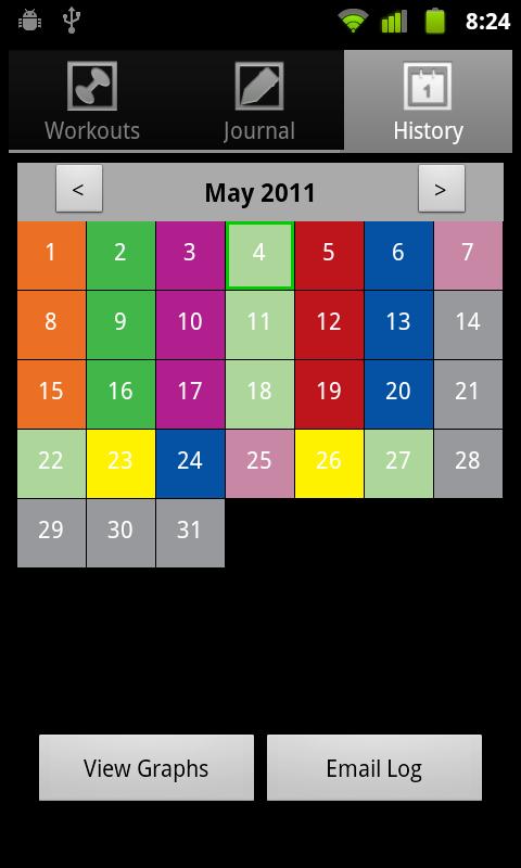 The History calendar lets you easily review and edit previous days' workouts, as well as view your progress in any exercise as a graph! You can also email yourself a complete workout and journal log at any time!