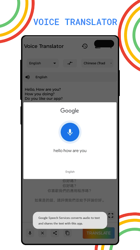 صوتی مترجم کی خصوصیت آپ کو آڈیو مترجم کے ساتھ کچھ بھی بولنے اور آسانی سے بات چیت کرنے کے لیے آواز کا ترجمہ کرنے کی اجازت دیتی ہے۔ تمام زبانوں کا ترجمہ غیر ملکی زبانیں سیکھنے میں مدد کرتا ہے بطور سفری مترجم دنیا بھر میں ترجمہ کے ساتھ جانے اور کہیں بھی بات چیت کرنے کے لیے۔